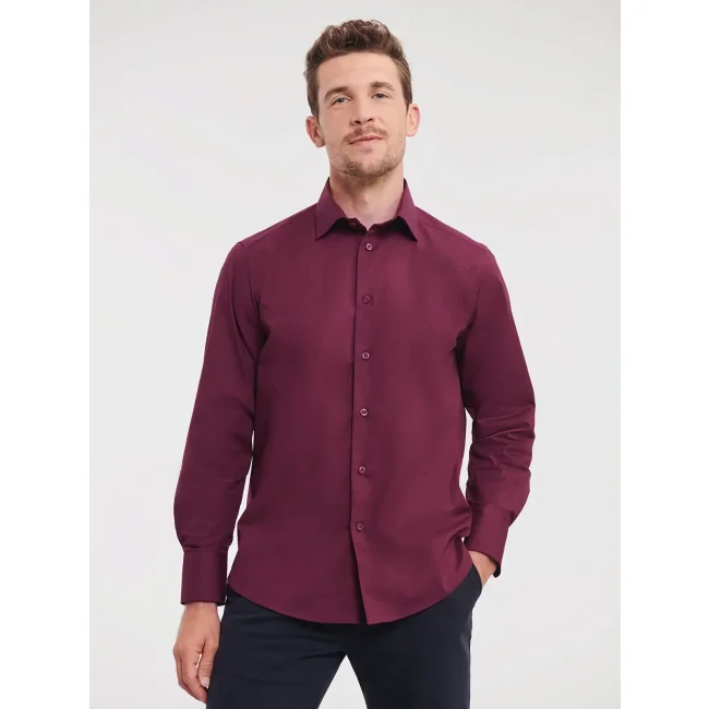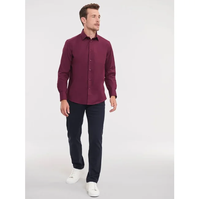 97% cotone, 3% elastane. Camicia elegante, colletto semiaperto con bottone singolo perlato, orlo stondato, polsino stondato con 2 bottoni. Bottone di riserva.