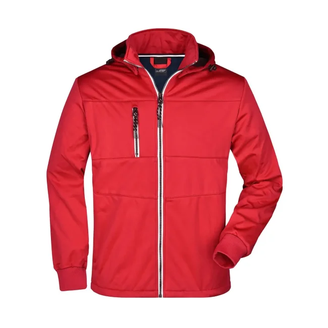 100% poliestere. Giacca in softshell in tessuto funzionale a tre strati con membrana TPU, antivento, idrorepellente, traspirante e permeabile al vapore. Cappuccio removibile, due tasche laterali e un taschino interno con cerniera, polsini lavorati a maglia.