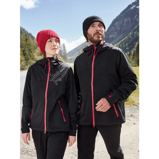 100% poliestere. Giacca in softshell 1 strato ultraleggera. Tessuto funzionale con membrana TPU antivento e impermeabile, traspirante e permeabile al vapore, cuciture ermetiche (colonna d'acqua 10.000 mm) chiusura lampo impermeabile, due tasche laterali con cerniera. cappuccio regolabile, parte posteriore leggermente più lunga.