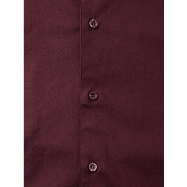 97% cotone 3% elastan. Camicia elegante, colletto semiaperto con bottone singolo perlato, orlo stondato. Bottone di riserva.