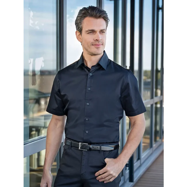 64% cotone, 32% poliestere, 4% elastan. Camicia a maniche corte da uomo, vestibilità moderna, colletto classico, lavabile a 60°C