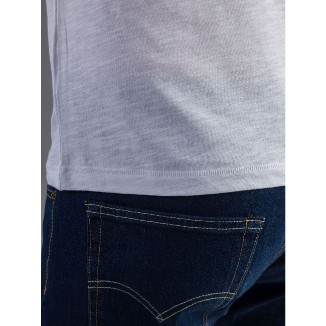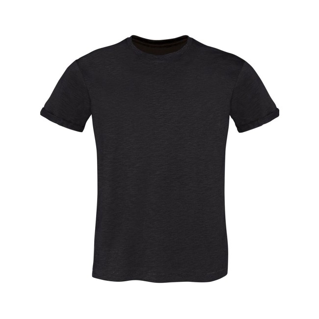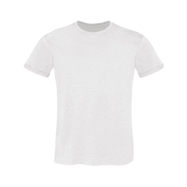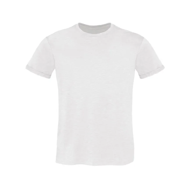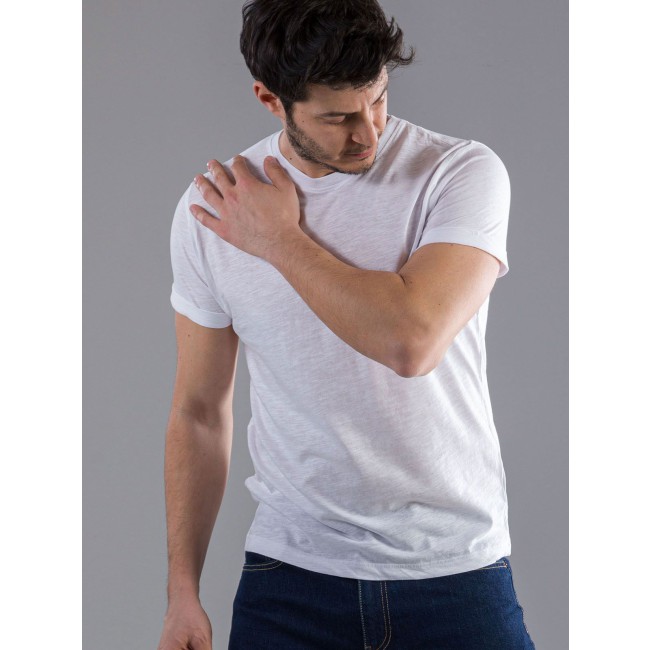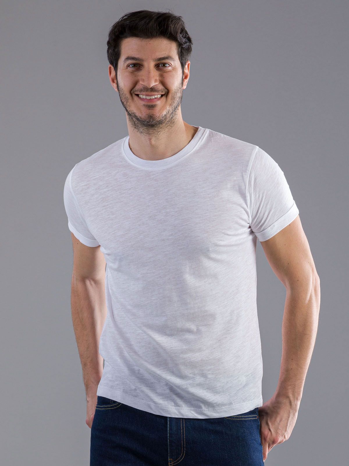 100% cotone . T-shirt manica corta, set-in, girocollo, tessuto slub ring-spun single jersey, giromanica con orlo arrotolato e cucitura in 4 punti, struttura con cuciture laterali. Etichetta strappabile.