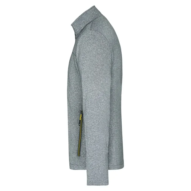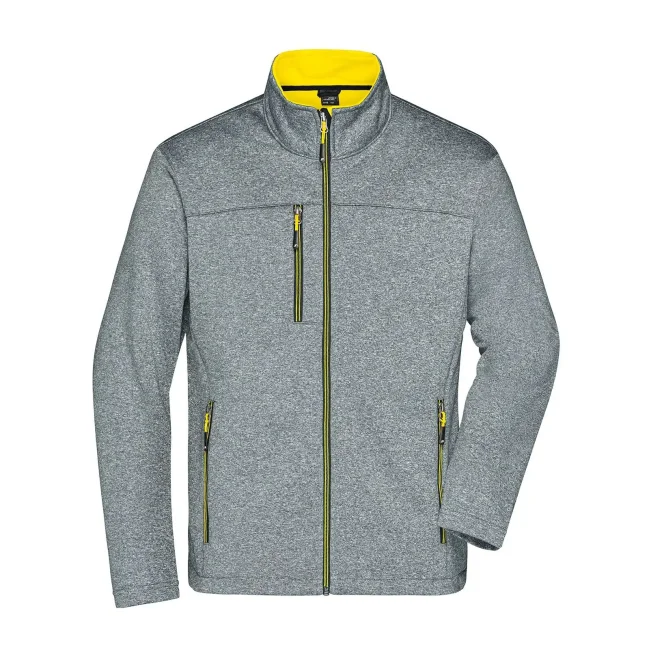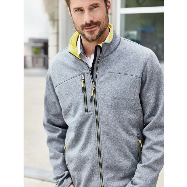 100% poliestere. Giacca in softshell a 2 strati, parte interna in pile di colore contrastante. Cerniera frontale nascosta con protezione per il mento, collo alto, 2 tasche laterali e 1 tasca sul petto con cerniera.