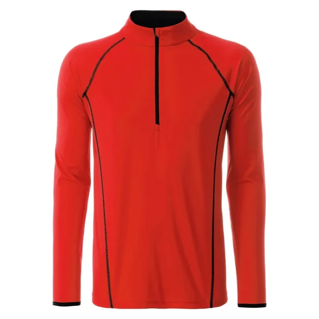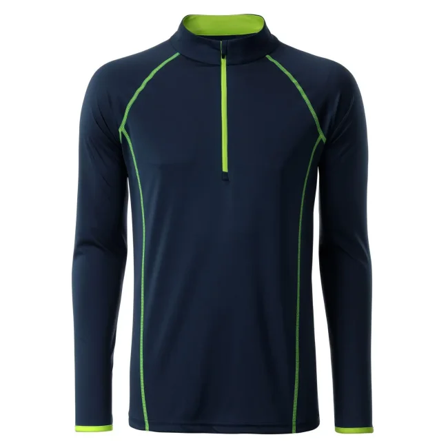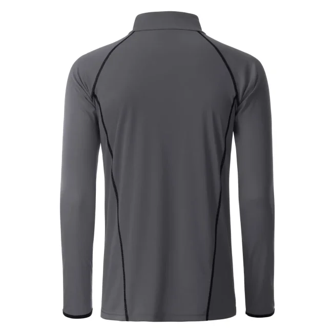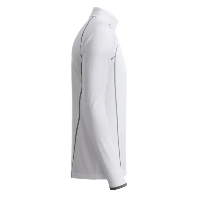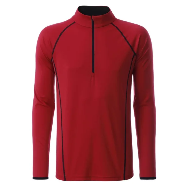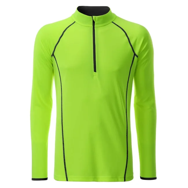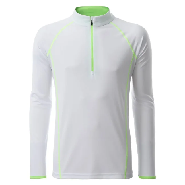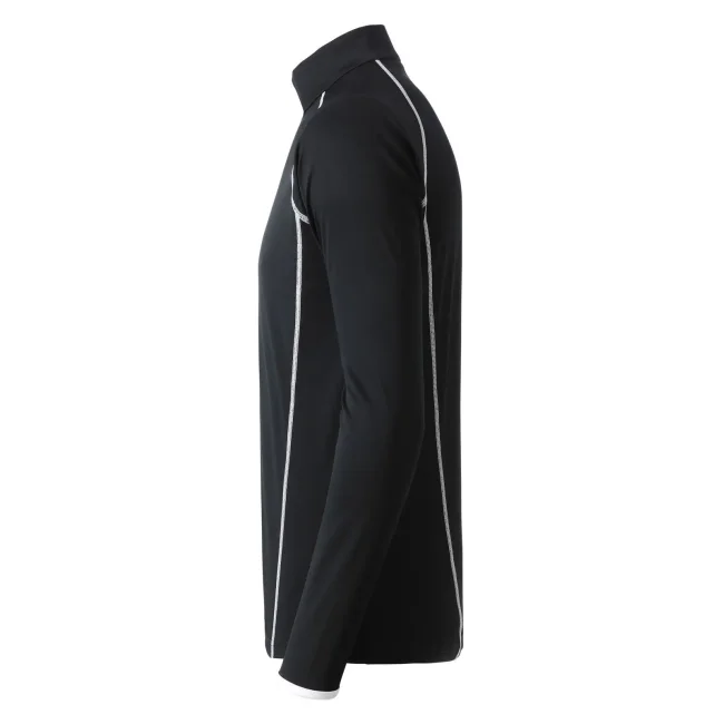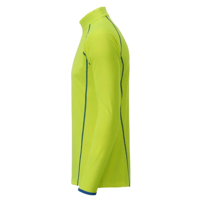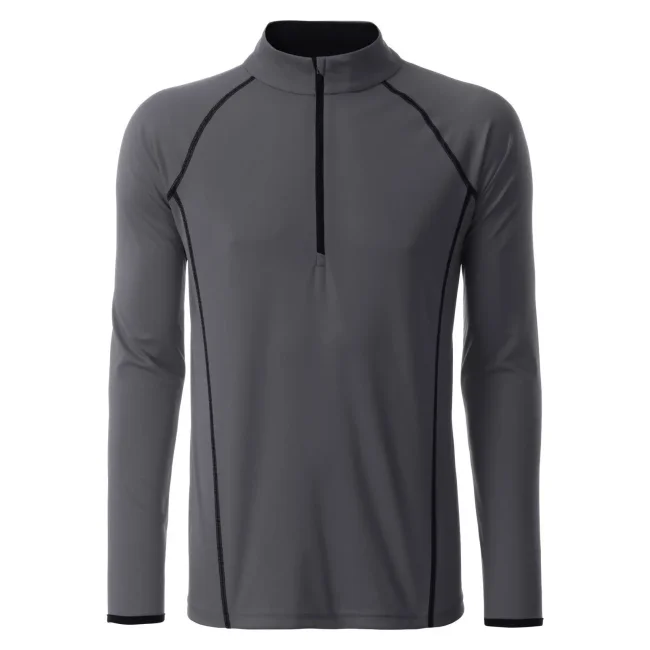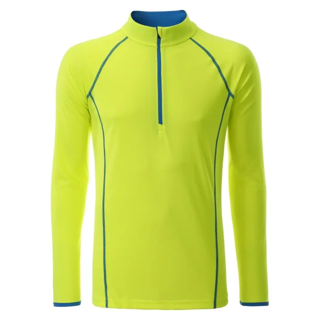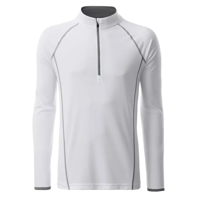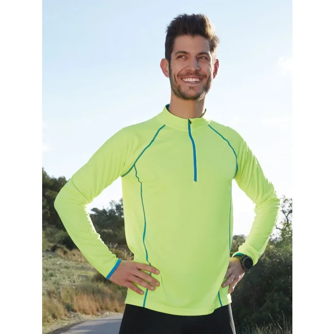100% poliestere. T shirt manica lunga per fitness e sport Transpirante e con regolazione umidità. Asciugatura rapida, leggera e confortevole. Maniche raglan, collo alto. Cuciture in contrasto sul davanti e sul retro. Zip con protezione per il mento. Tessuto esterno (130 g/m²).