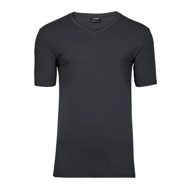 T-shirt uomo collo a V, 195 g/m², 90% cotone pettinato ring-spun, 10% elastan, elastan conferisce maggior stabilità e morbidezza, pre-ristretto, capo trattato con enzimi per un tessuto più soffice, fettuccia al collo, collo in Lycra, doppia cucitura