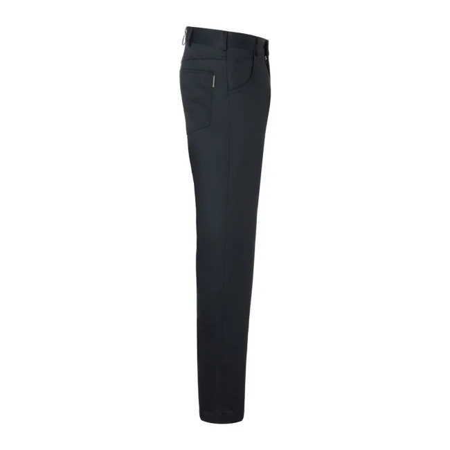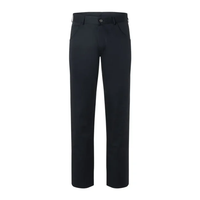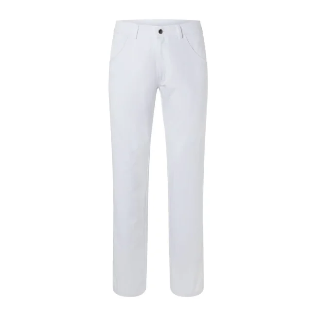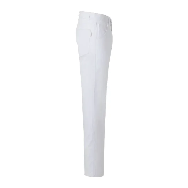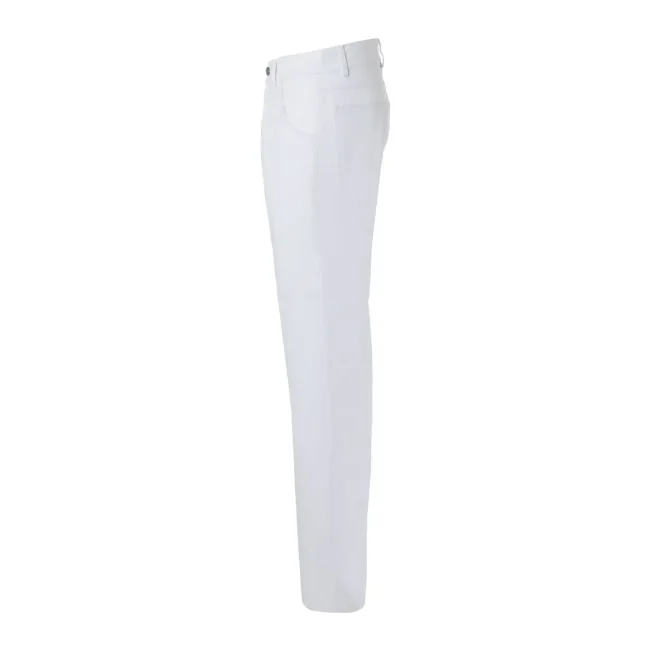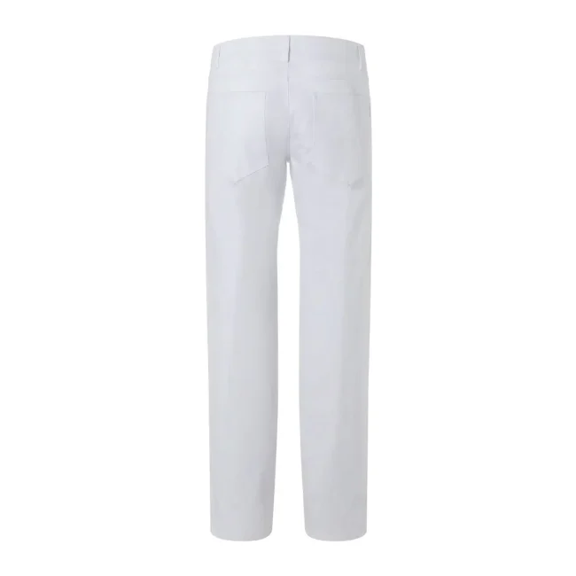 65% poliestere, 35% cotone. Pantaloni in twill dal tessuto rifinito, irrestringibile, lavabile, pratico, cinque tasche, gamba dritta, passanti per cintura. Colore Bianco lavabile a 95°C.