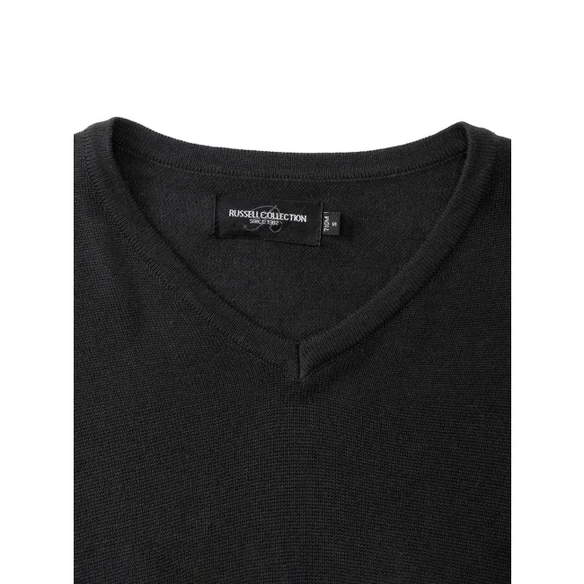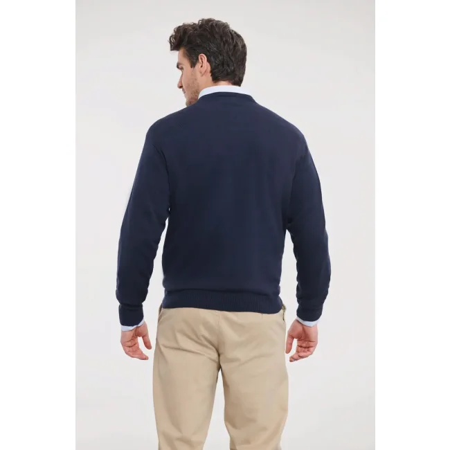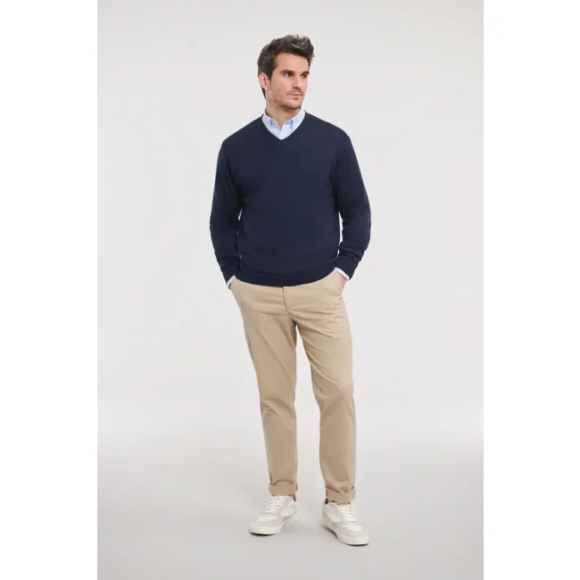 50% cotone, 50% acrilic. Pullover uomo con scollo a V, costina 1X1, polsini e girovita con elastane, maniche a giro, lavabile a 40°C. Cuciture laterali.