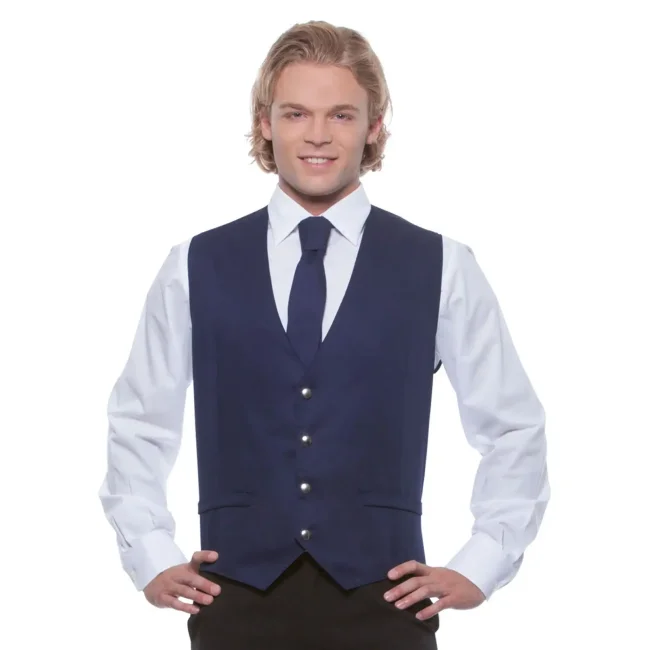 65% poliestere, 35% cotone. Gilet da uomo Kai, cotone twill, 215 g/m² - tessuto rifinito, irrestringibile, lavabile, pratico - aderente, cuciture Vienna, regolabile in vita con legacci - 2 Finte tasca - 4 bottoni sul bordo - adatto per lavaggi industriali -
