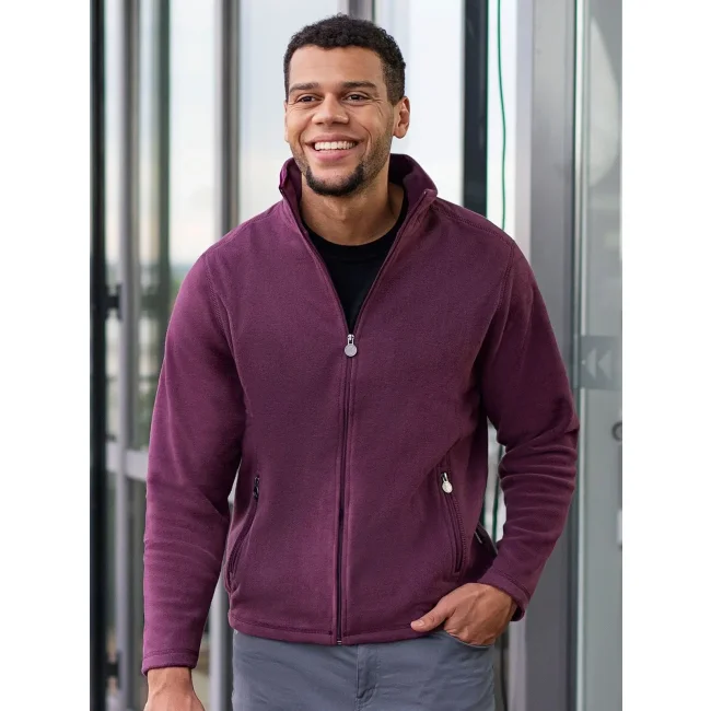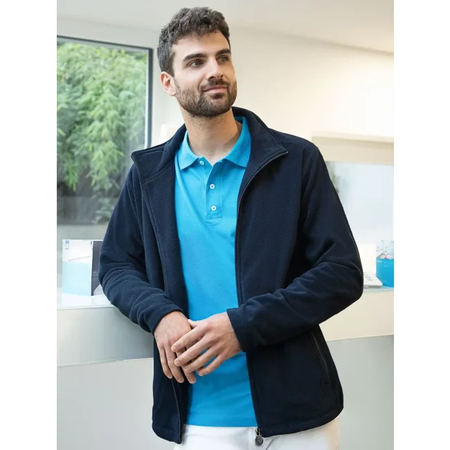 100% poliestere riciclato, 280 g/m². Giacca in pile da uomo calda, resistente e sostenibile, easy-care. Colletto alto, felpata all'interno e all'esterno, rinforzi sulle spalle, elastico ai lati della vita, 2 tasche laterali con cerniera tono su tono. Prodotto certificato GRS, Green Button e Oeko-Tex.