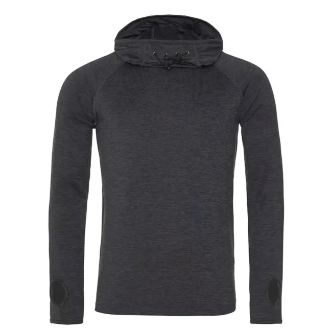 92% poliestere 8% elastan. Maglia da uomo con cappuccio, collo ad anello, maniche raglan, elementi riflettenti sul cappuccio, cuciture piatte, etichetta strappabile.
