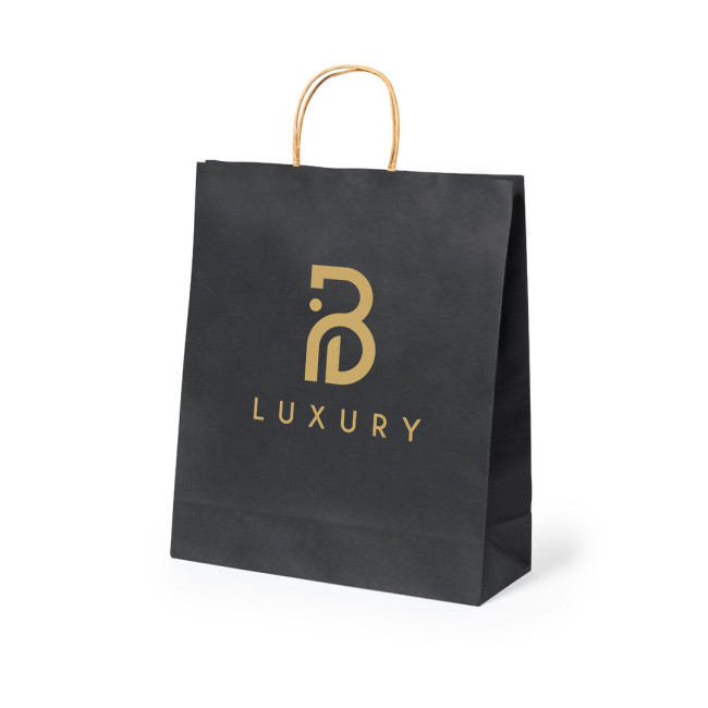 Borsa della linea natura, realizzata in carta riciclata da 100g/m2 rifinita in nero, con manici corti rinforzati in tonalità naturale e soffietto. Resistenza fino a 8 kg di peso.