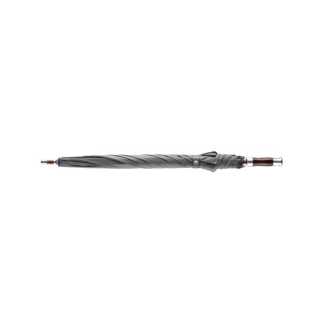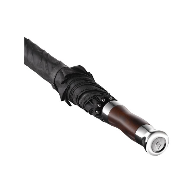Elementi con cromatura lucida, impugnatura diritta in vero legno di acero fiammato con applicazioni cromate, stecche in fibra di vetro flessibili, pregiato sistema Windproof per una flessibilità massima del telaio in caso di forti raffiche di vento, classica fodera Façonné, chiusura in velcro con bottone a pressione cromato, custodia pregiata con bordatura e ampia apertura, cerniera di apertura cromata. Diameter: 115 cm, lunghezza da chiuso: 87 cm, 8 pannelli.