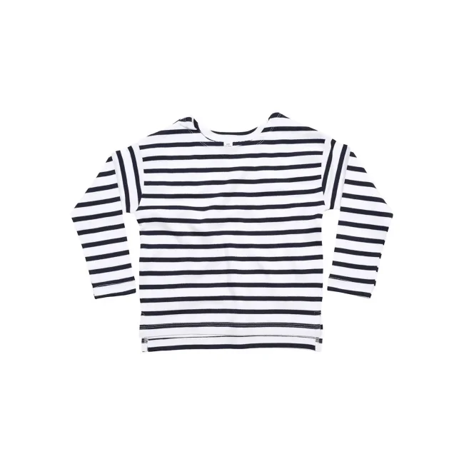 100% Cotone Organico interlock. maglia unisex bambini, maniche lunghe, spacchi laterali, più lunga sul retro, stampa a righe tinta in filo, etichetta strappabile.