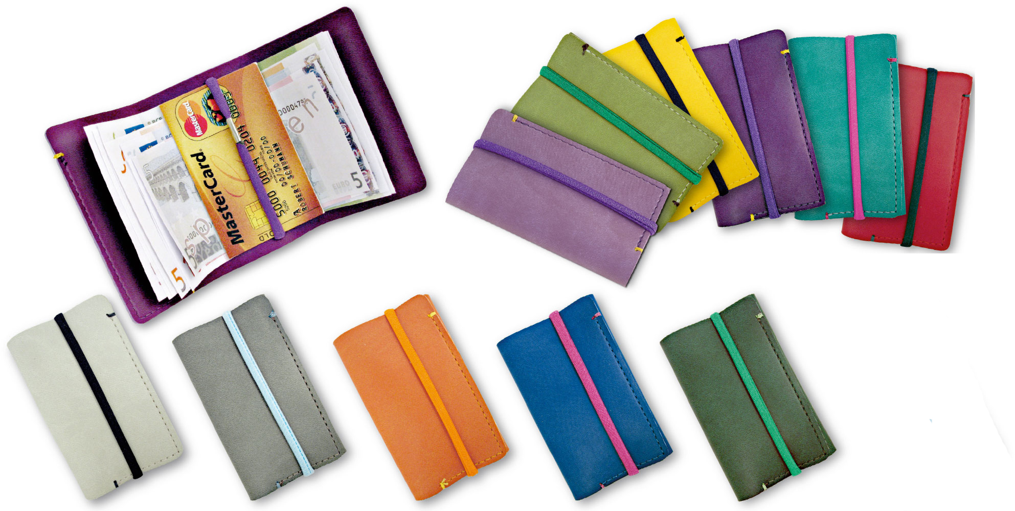 Mini portacarte realizzato in vivella double face, dotato di elastico viola. Questo accessorio compatto è pensato per contenere soldi e carte in modo pratico e professionale. La personalizzazione è disponibile per un tocco distintivo, rendendolo adatto anche per branding aziendale.