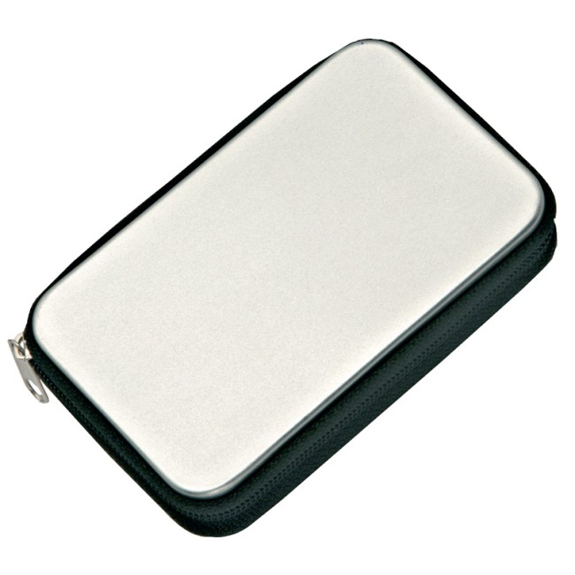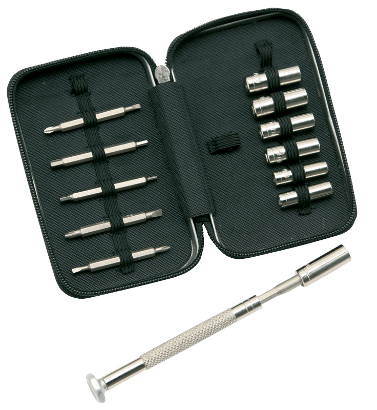 Astuccio in alluminio con chiusura a cerniera e 13 accessori.