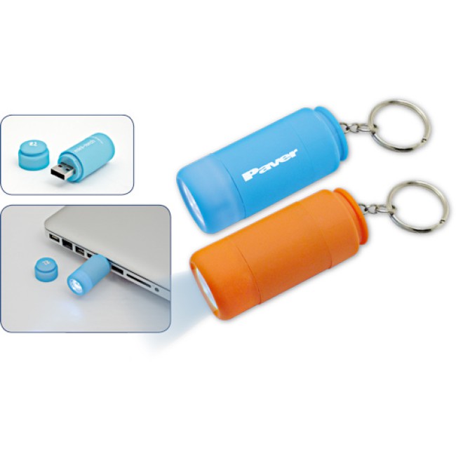 Mini torcia con anello portachiavi, dotata di luce a led, si carica inserendola alla porta USB del computer, 0,5 Watt. Confezione scatola bianca.