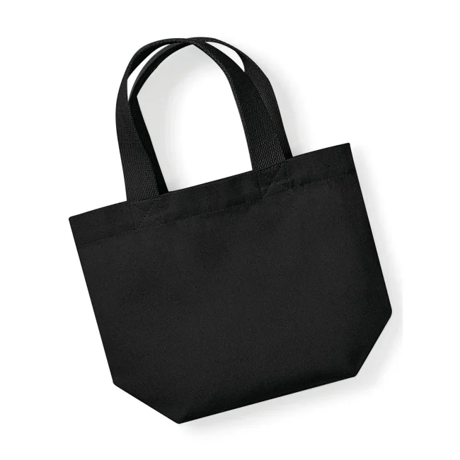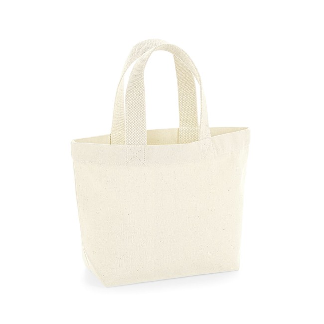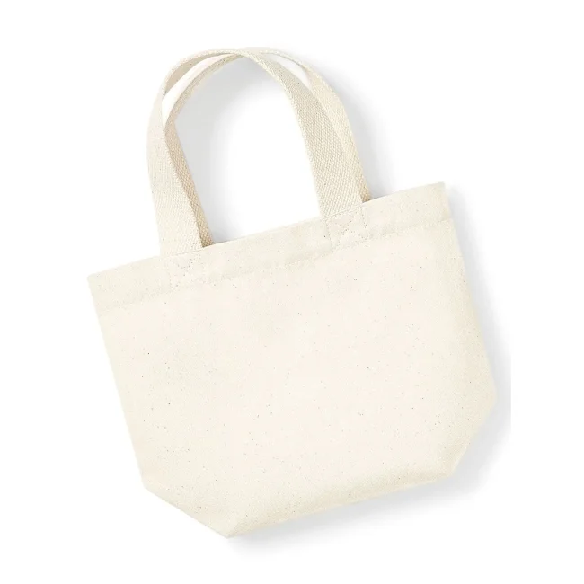 100% cotone organico Canvas. Mini shopper in cotone certificato GOTS, tessuto resistente, manici in cotone. Etichetta removibile. Lunghezza manico: 34 cm. Dimensioni: 26x21x10 cm, capacità: 4 litri, area stampabile: 22x16 cm.