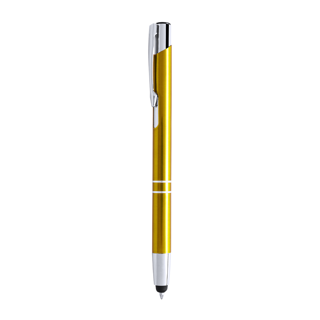 Penna touch con meccanismo a pulsante in colori divertenti. Finitura in alluminio lucido, cartuccia jumbo e inchiostro blu.