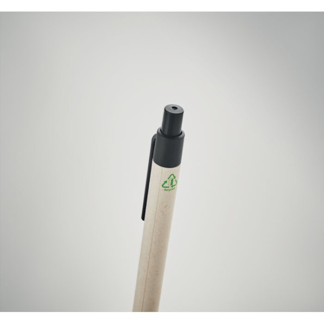 Penna a sfera a pulsante con fusto in cartone riciclato del latte (70%) e parti in PLA (in mais biodegradabile al 100%). Inchiostro blu.