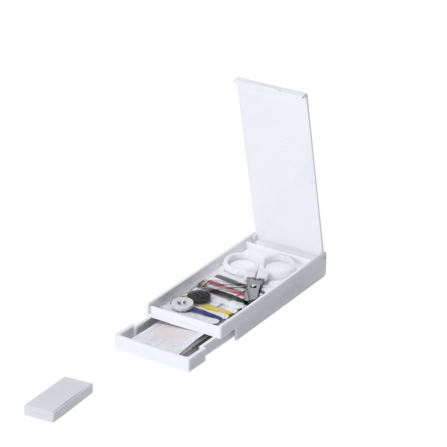 Set da cucito in ABS. Con due scomparti, uno per accessori e un altro che include 5 cerotti. Comprende: - 6 fili di colori diversi; bianco, blu, giallo, bianco, nero, rosso e grigio. - 1 ago- 2 bottoni- 1 spillo- 1 forbiceIdeale da portare in borsa, al lavoro o in viaggio, grazie alla sua dimensione compatta.