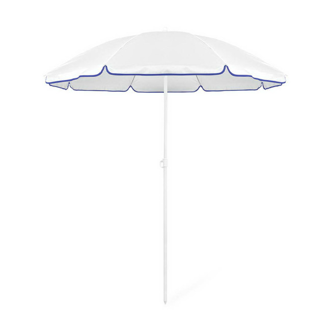 Ombrellone a 8 pannelli in resistente nylon in un'ampia gamma di colori vivaci. Da 150 cm di diametro, con bordi laterali, tubi metallici bianchi e altezza regolabile. Presentato in una custodia in PVC con tracolla.