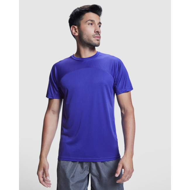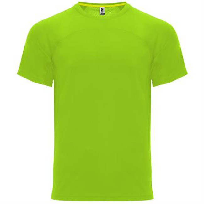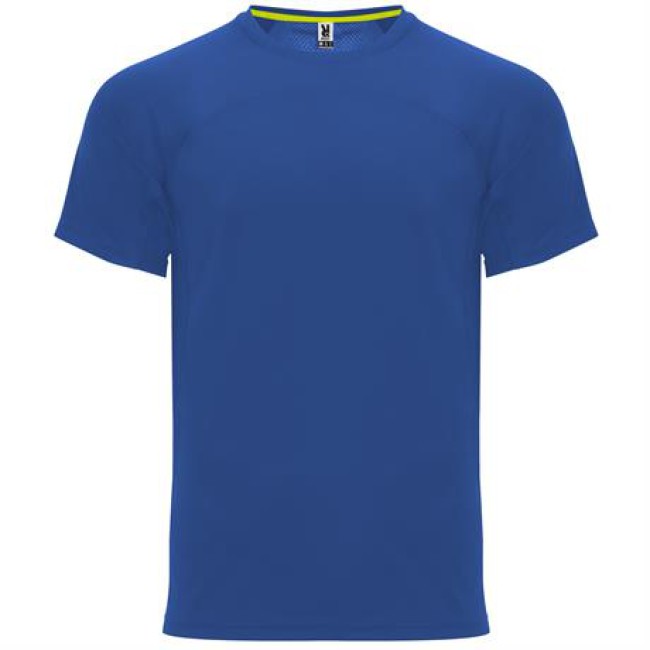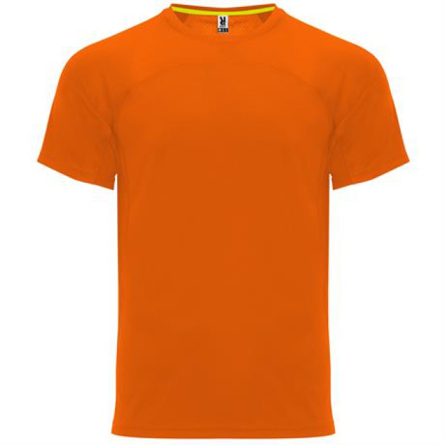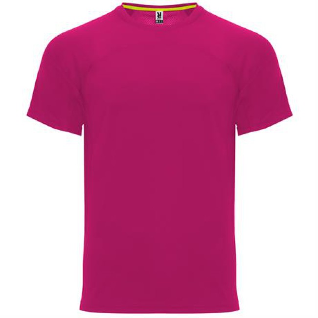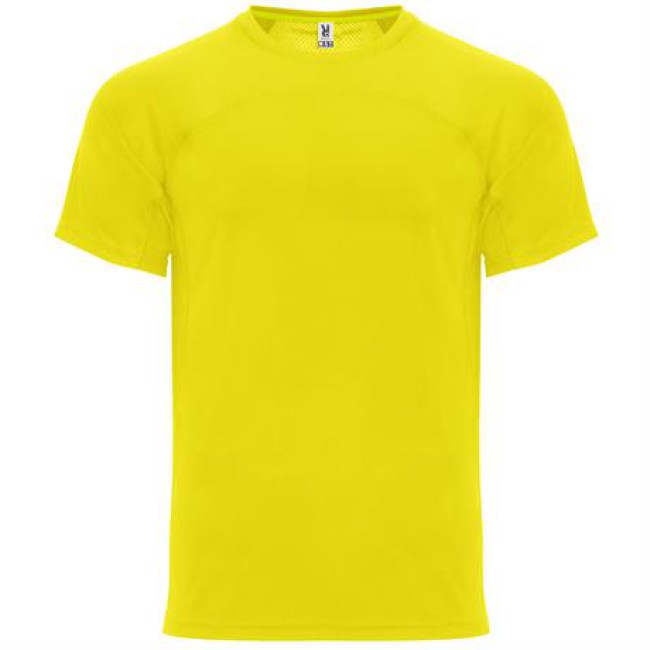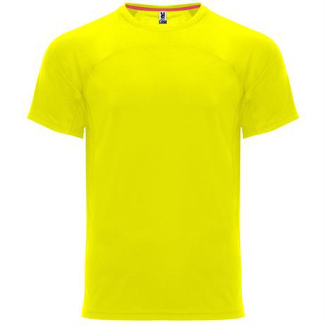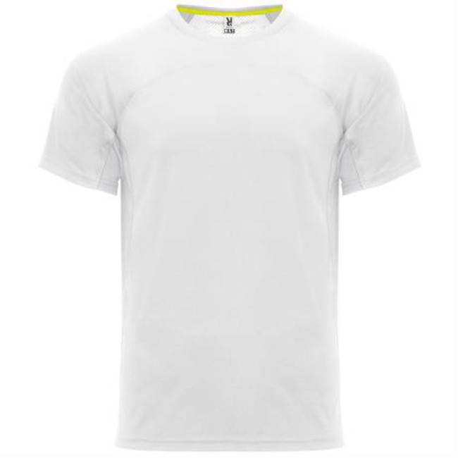 T-shirt tecnica unisex manica corta.1. Girocollo con copri cuciture di rinforzo a contrasto nel colore giallo fluo.2. Parte posteriore in due tessuti di poliestere.