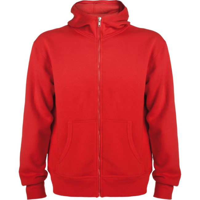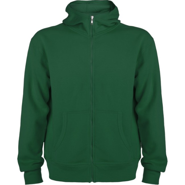 Felpa stile casual con cappuccio. Collo altto e cerniera lunga. Particolari in costina intorno a cappuccio e tasca. Tasca stile canguro. Polsini e girovita in costina 2x2 con elastane.