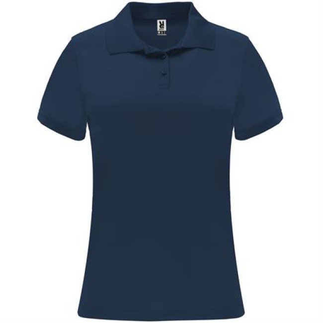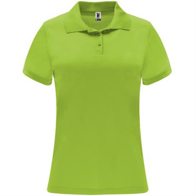 Polo tecnica a manica corta da donna. Collo tricot con chiusura a tre bottoni. Taglio sfiancato.