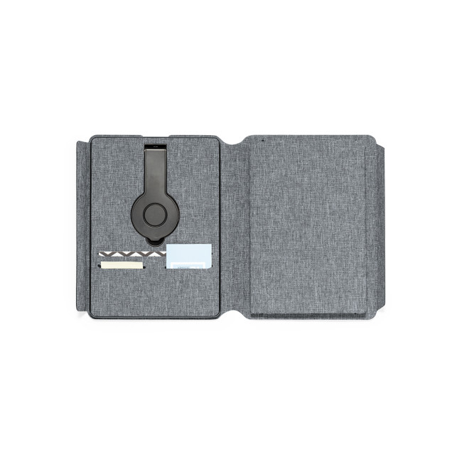 Cartellina/raccoglitore multifunzionale con chiusura magnetica in poliestere 300D RPET, ricavato da plastica riciclata. Con etichetta RPET all'interno.Include caricatore wireless multiposizione da 10W integrato nella copertina, con attacco magnetico per poter utilizzare il dispositivo durante la ricarica e anello adesivo incluso, valido per tutti i dispositivi con tecnologia Magsafe e Qi. Interno con caricatore wireless per smartwatch.Batteria integrata con capacità di carica di 5.000 mAh, con porta di ingresso/uscita Type-C e indicatori di stato di carica a LED, cavo incluso.Interno con supporto per smartphone e numerosi scomparti per carte, tra cui portapenne e blocco A5, con blocco da 64 fogli e layout a righe singole.Presentato in un'attraente scatola dal design personalizzato.Le capacità indicate su tutti i nostri power bank esterni sono reali, tutti incorporano batterie di grado A, non riciclate, con una durata di almeno 500 cicli di carica e conformi alla normativa CE. Inoltre, sono prodotti secondo gli standard RoHS e in conformità ai seguenti requisiti di sicurezza:Sistema di protezione da sovraccarico del power bank.Sistema di protezione dalla scarica completa per una maggiore durata del power bank.Sistema di blocco per prevenire i cortocircuiti.Sistema di trasferimento costante della carica, in base alla capacità del dispositivo di destinazione".