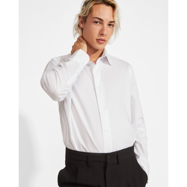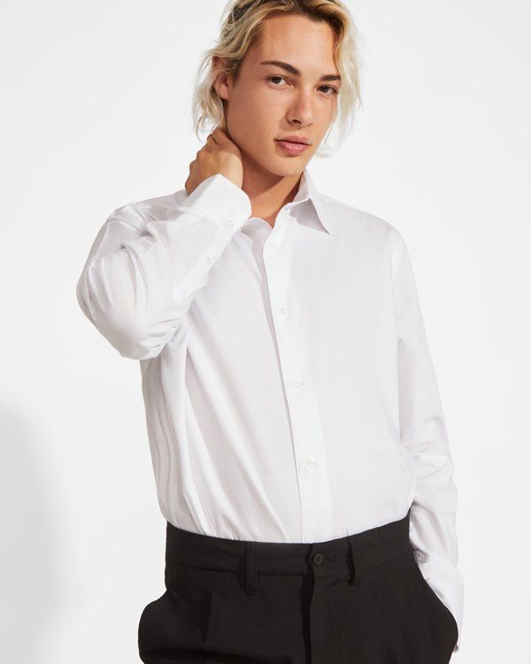 Camicia a maniche lunghe con tessuto elasticizzato. · Collo intrecciato. · Polsini con 2 bottoni e fondo sagomato.