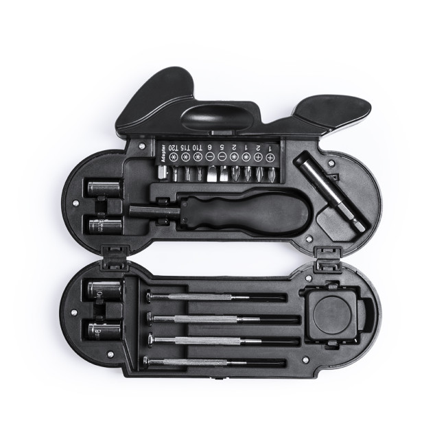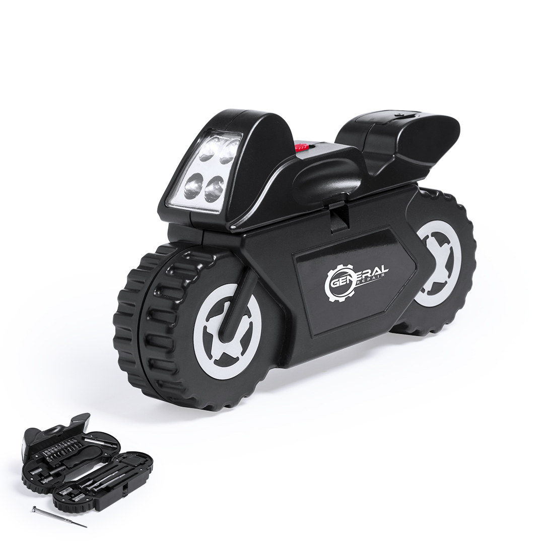 Set di utensili da 14 accessori in una robusta valigetta dal design a fomra di moto con torcia a 4 LED integrata. Include set di cacciaviti di precisione, pinza, cacciaviti a testa piatta e Phillips e chiavi a bussola esagonali. Batterie a bottone incluse. Confezionato singolarmente.