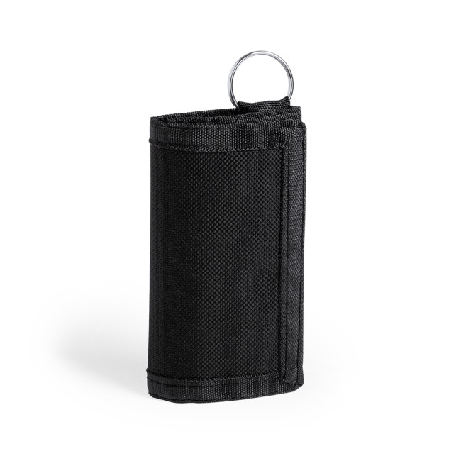 Portamonete con portachiavi in resistente poliestere 600D in colori vivaci e chiusura in velcro. Interno con portamonete con cerniera, scomparto per carte e portachiavi.