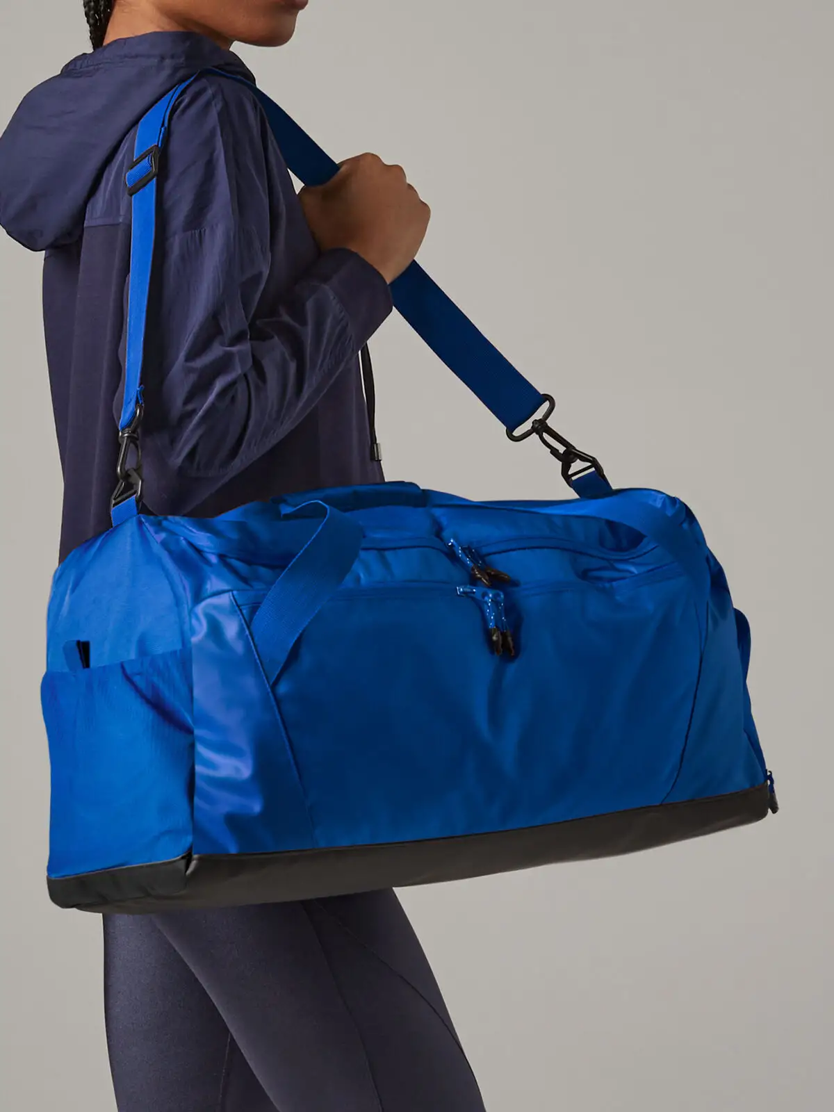 100% poliestere riciclato. Borsone in poliestere riciclato certificato GRS, apertura con due zip bidirezionali, tasca dedicata per racchetta, adatto per racchette fino a circa 23cm di larghezza, manicotto per mazza da hockey con elastico di fissaggio, tasca porta scarpe e tasca impermeabile porta indumenti bagnati, tasca frontale con zip, tasca posteriore con zip, tasca laterale in rete elasticizzata, tracolla regolabile e removibile. Dimensioni: 51x26x20 cm, Capacità: 26 litri. Etichetta strappabile.