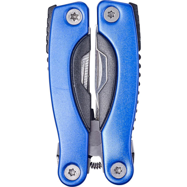 Multi tools 8 funzioni, compatto in acciaio inox, include doppia pinza, cacciavite (a punta piatta e a stella), lima, seghetto, coltello, schiaccianoci, apri-lattina e apribottiglie, in comoda custodia