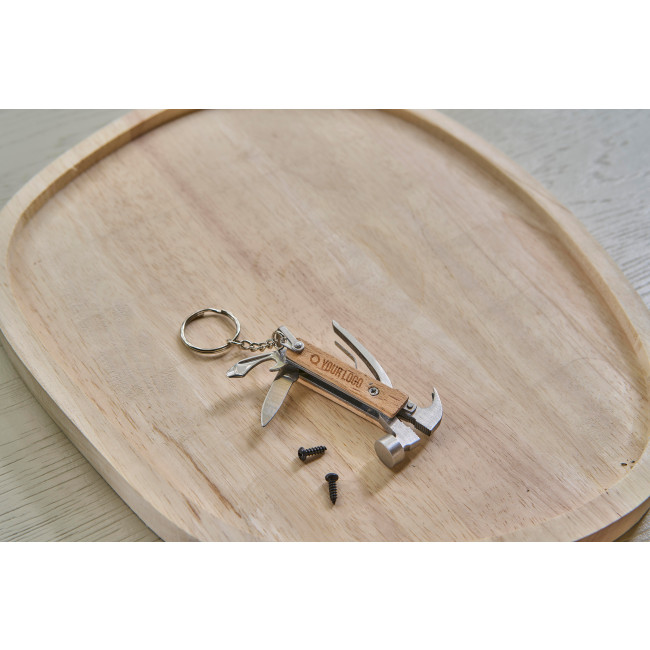 Multitool in bambù con 7 funzioni, incluso portachiavi, confezionata singolarmente in una scatola in cartone avana