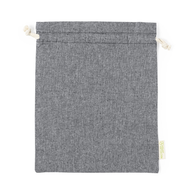 Borsa ecologica in resistente materiale cotone riciclato da 120g/m2. Certificazione GRS (Global Recycled Standard), che garantisce lorigine riciclata del materiale utilizzato per la fabbricazione del prodotto. Chiusura con coulisse in cotone e finiture cucite, compresa etichetta esterna con il logo del cotone riciclato.