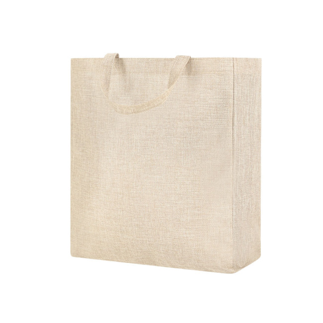 Shopping bag realizzata in morbido e resistente poliestere, ideale per personalizzazione tramite stampa in sublimazione. Con fondo e manici rinforzati. Resistenza fino a 6 kg di peso.