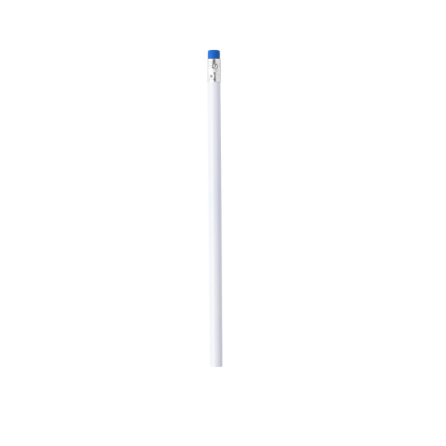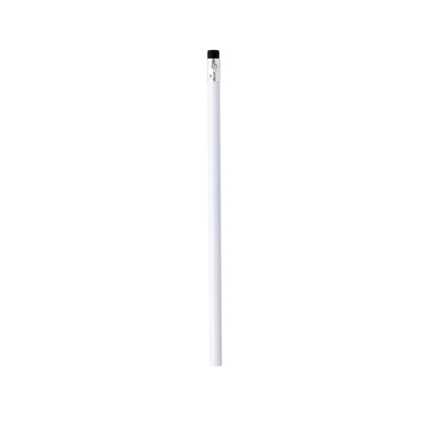 Matita in legno in colore bianco con finitura lucida. Corpo rotondo e gomma disponibile in vari colori. Mina nera e punta non affilata.