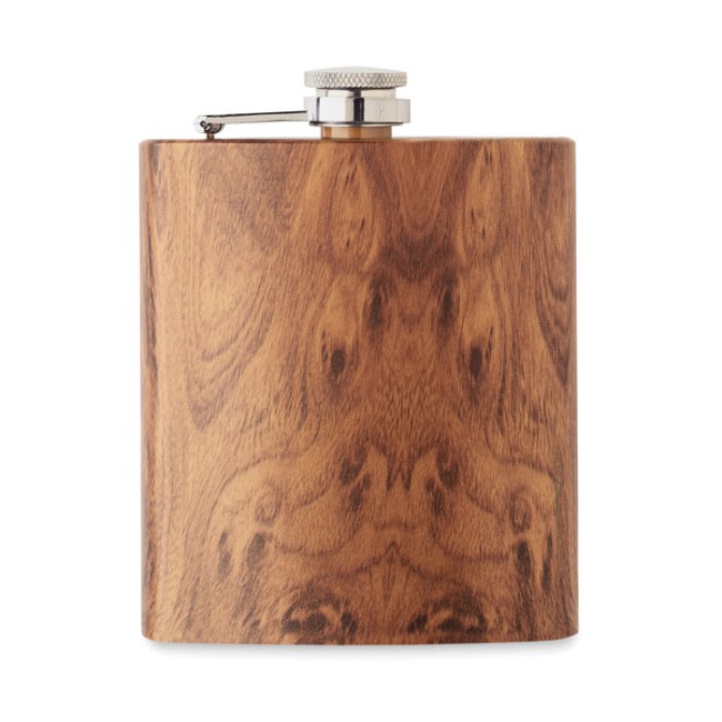 Fiaschetta sottile in acciaio inox riciclato (90% acciaio inox riciclato e 10% acciaio inox) con aspetto in legno. Capacità 190 ml.
