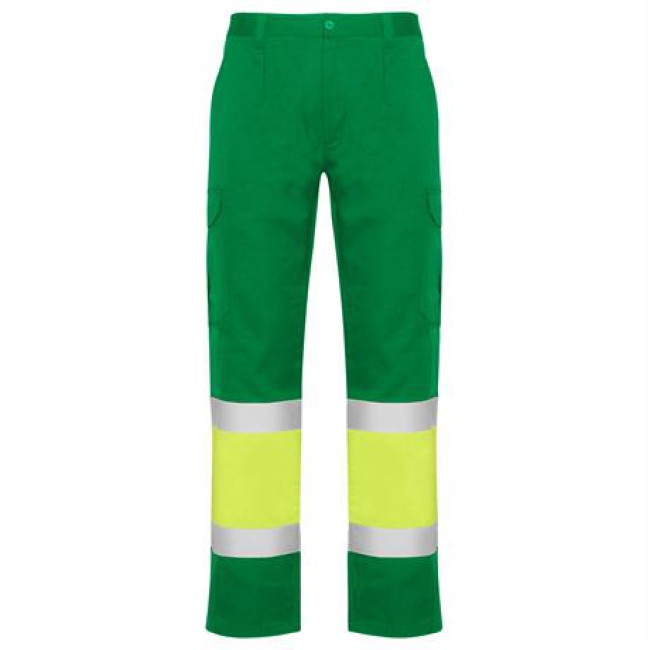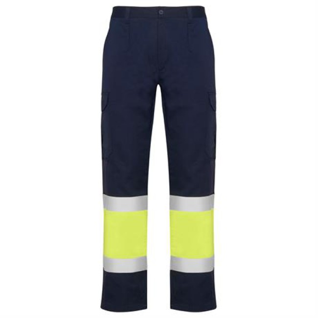 Pantaloni estivi multitasche ad alta visibilità. · Elastico in vita sul retro. · Due tasche con patta sul retro e chiusura a velcro. · Due tasche sul davanti e due tasche laterali con soffietto e chiusura a velcro. · Bicolore con bande riflettenti.