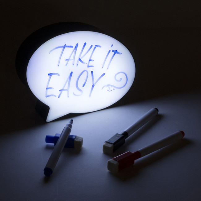 Divertente lavagna con interno illuminato da 8 LED. Con pulsante ON/OFF e tre pennarelli con cancellino nei colori blu, nero e rosso inclusi. Alimentazione a batteria: 3xAAA non incluse e confezionata in una scatola dal design accattivante.