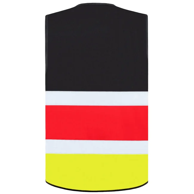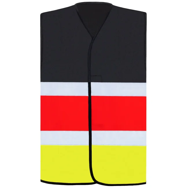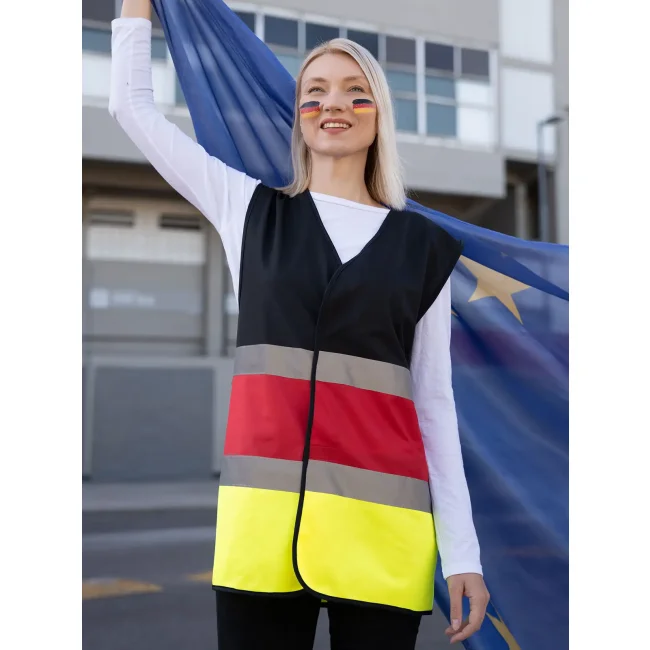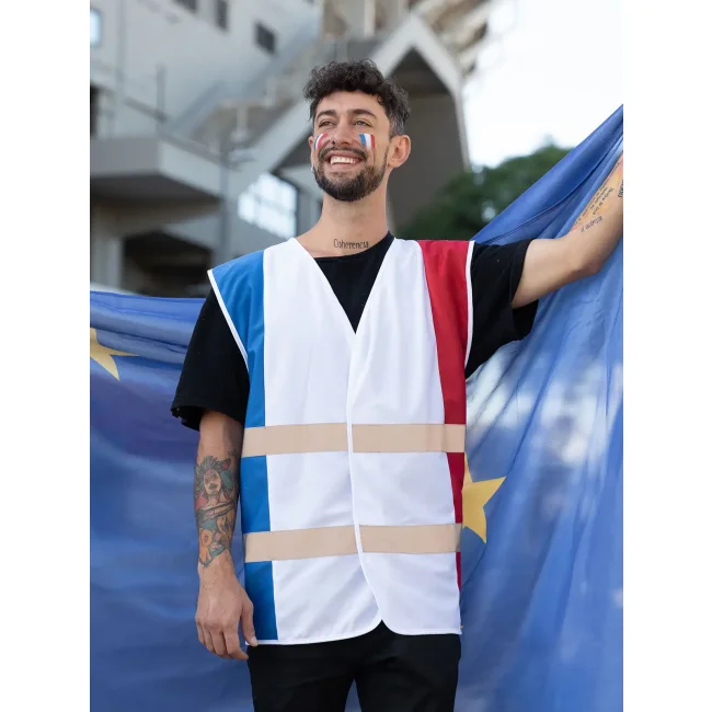 100% poliestere. Gilet ad alta visibilità con i colori delle nazioni. Offre una visibilità ottimale grazie alle due strisce riflettenti e ai colori vivaci delle rispettive bandiere nazionali. Adatto per eventi sportivi nazionali e internazionali. Chiusura in Velcro.