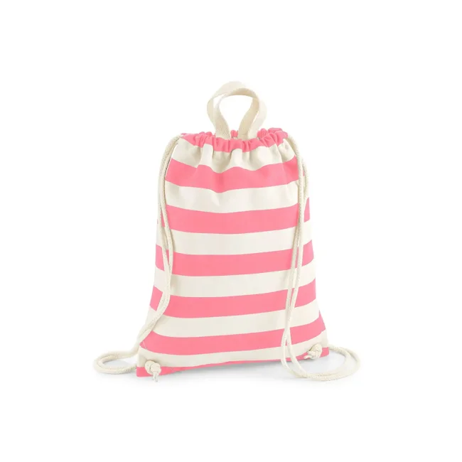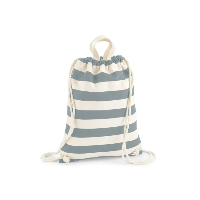 100% Cotone Canvas pettinato. Gymsac con motivo stampato a strisce, maniglia doppio uso/anelli portaoggetti. Chiusura a sacchetto con robusto cordoncino. Etichetta removibile. Dimensioni 37x46 cm. Capacità 12 litri. Area di stampa 30x32 cm.