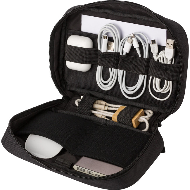 Necessaire da viaggio in poliestere rPET 600 D, chiusura lampo, include molteplici tasche per documenti e cavi di ricarica, chiusura in velcro