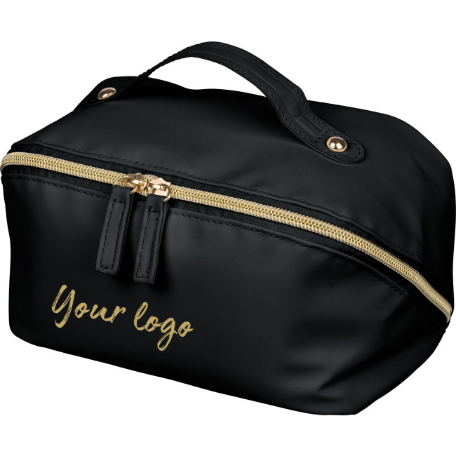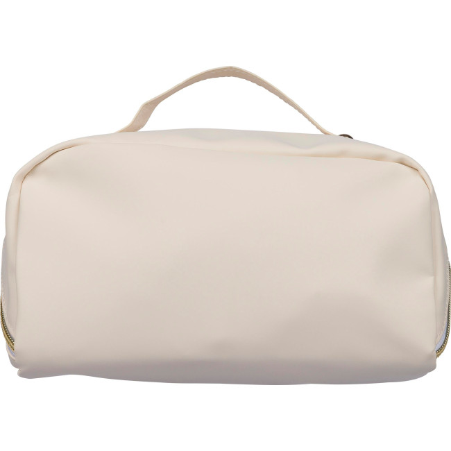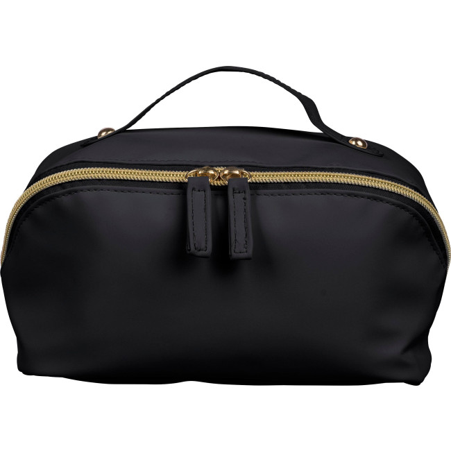 Necessaire in PU riciclato, chiusura lampo centrale per un’ampia apertura e facile accesso, dotata di manico corto per il trasporto, interno spazioso con quattro scomparti, incluso un piccolo taschino interno con cerniera, rifinita con fodera in poliestere 210 D riciclato, etichetta materiale "riciclato" interna.