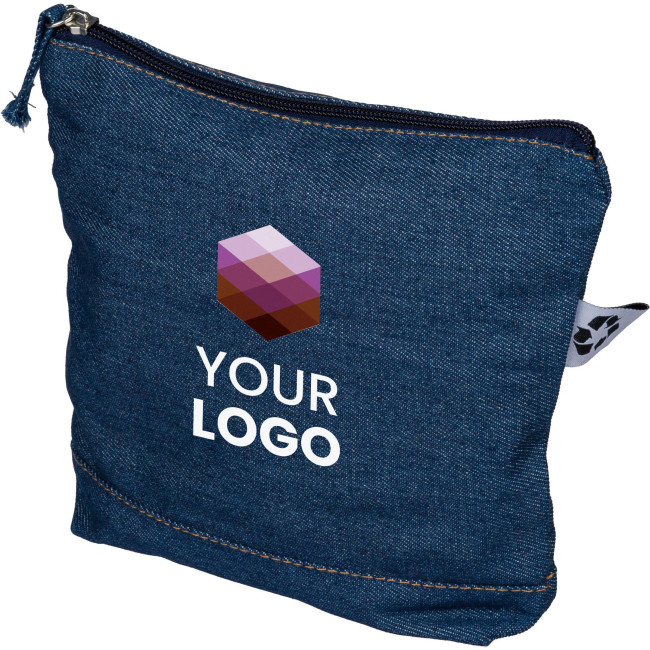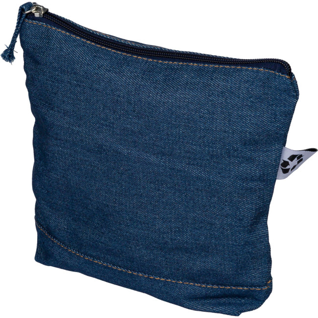 Necessaire in denim riciclato, dimensioni 21 x 18,5 cm, scomparto principale con chiusura lampo, etichetta materiale "riciclato" esterna.