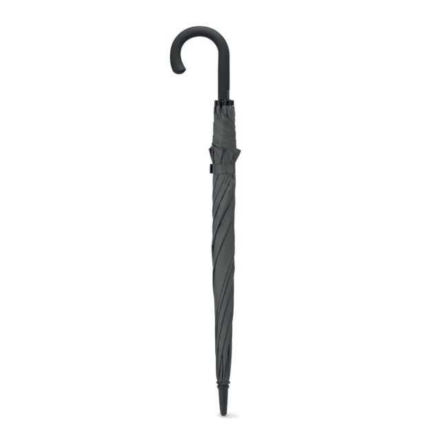 Ombrello automatico deluxe da 23'', in 190T con struttura in metallo placcata nero. Nervature in fibra di vetro nero e punte in plastica nera. Manico curvo nero in gomma ABS con pulsante grigio. Chiusura manuale.