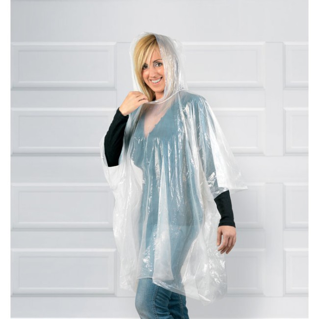 Poncho trasparente in PE contenuto in una confezione sferica di plastica AS con moschettone per essere attaccato alla cinta o a una borsa.