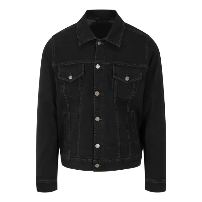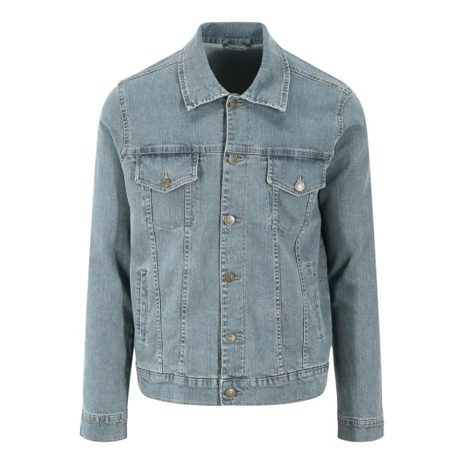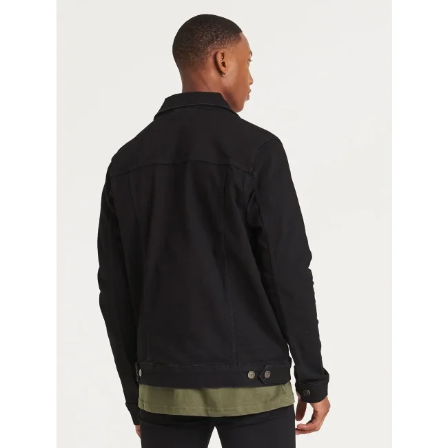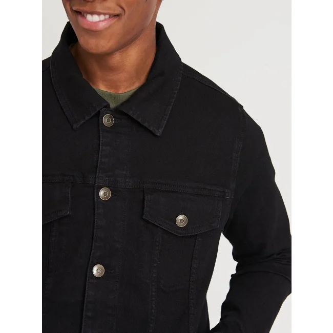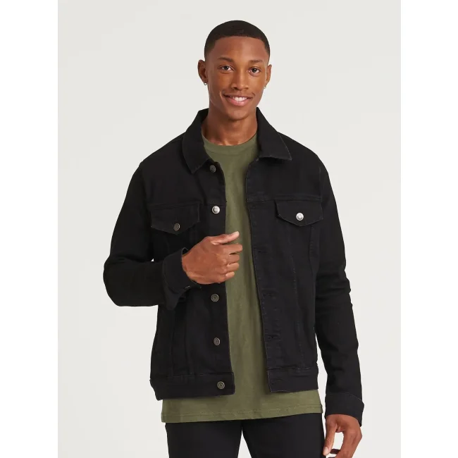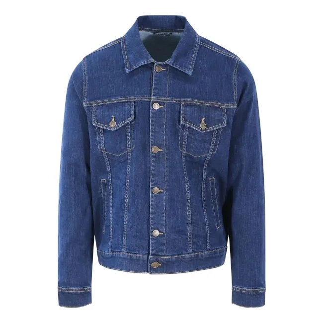 99% cotone, 1% elastan. Giacca da uomo in denim elasticizzato, 4 tasche, lavaggi nei colori blu scuro e chiaro, cuciture a contrasto, chiusura con bottoni automatici, dettaglio polsino con bottoni, passante posteriore sul retro.