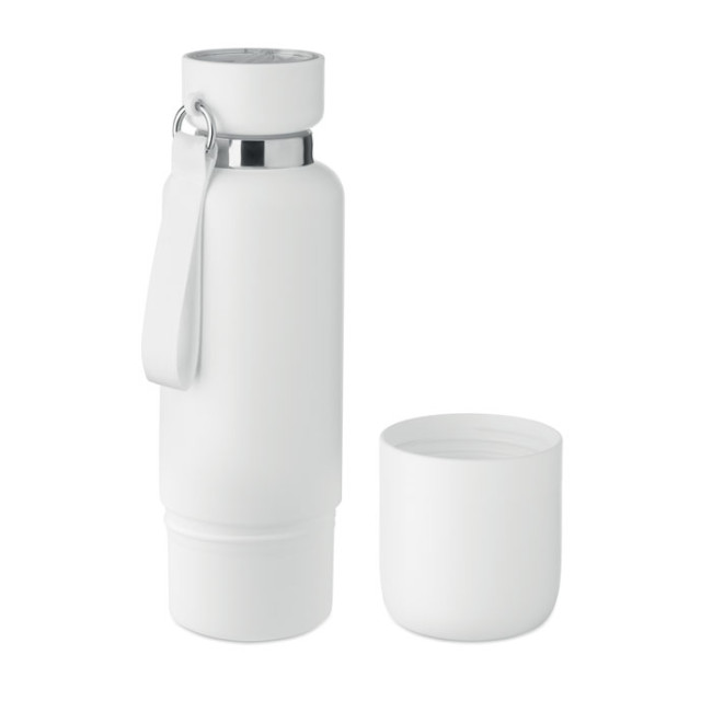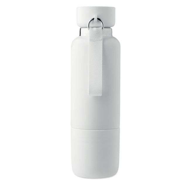 Bottiglia isolata a doppio strato in acciaio inox riciclato al 90% e acciaio inox al 10%, con manico a strappo integrato e cinghia lunga (70 cm) aggiuntiva nel coperchio in PP. Senza perdite. Tazza di fondo inclusa. Capacità: 500 ml.